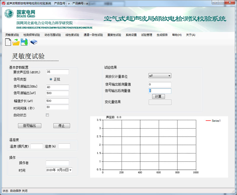 非接觸式超聲波局部放電檢測儀校驗系統(tǒng)的智能測控軟件能夠實現一鍵自動完成電壓調節(jié)、頻率調節(jié)、聲壓計自動設置等功能,軟件界面如下: