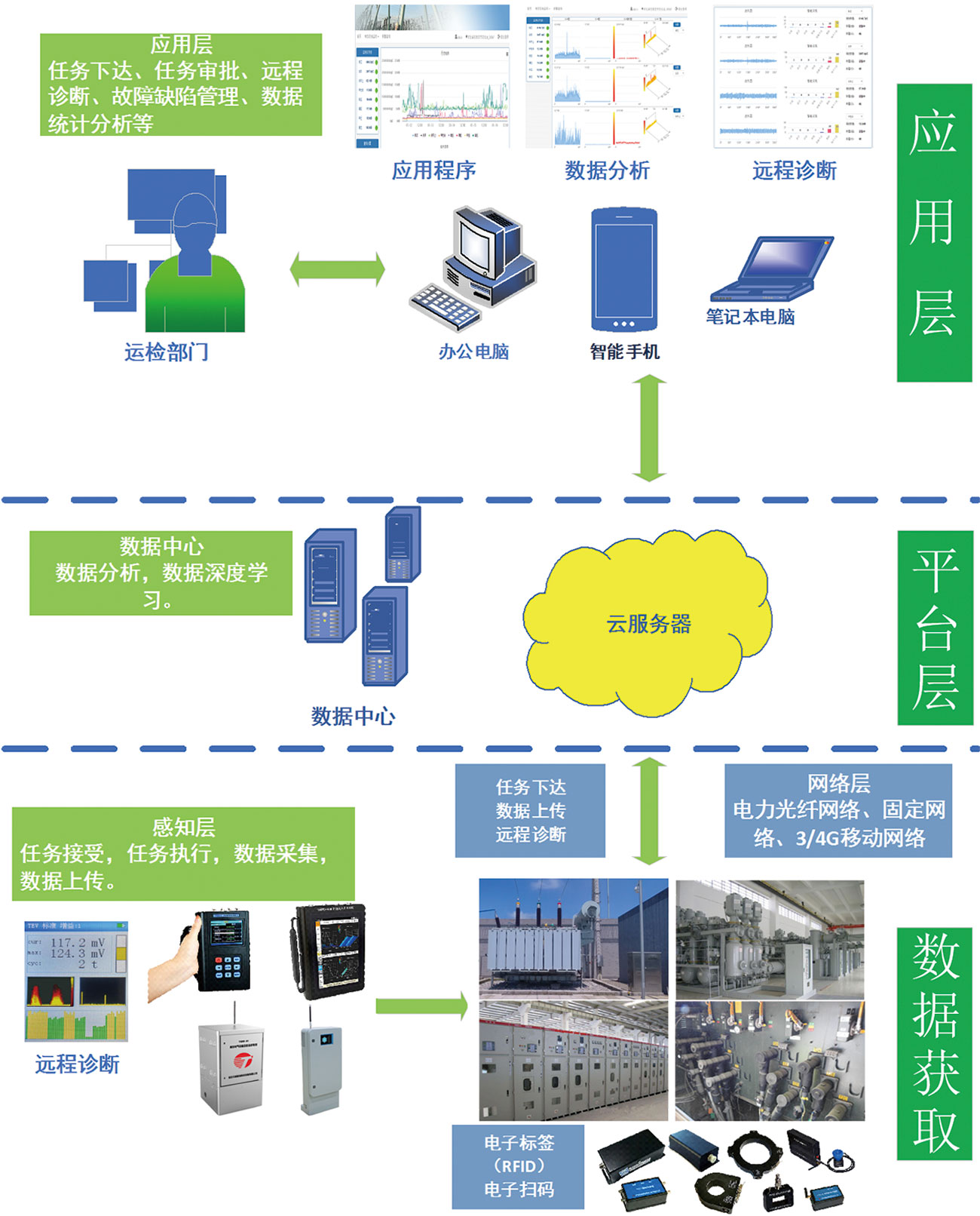 智能運(yùn)維管理平臺(tái)是基于物聯(lián)網(wǎng)的云服務(wù)智能運(yùn)維平臺(tái)。通過(guò)智能無(wú)線傳感器、智能數(shù)據(jù)交換終端、帶電巡檢設(shè)備等獲取高壓設(shè)備運(yùn)行狀態(tài)數(shù)據(jù),通過(guò)無(wú)線或者有線方式傳輸?shù)皆贫藬?shù)據(jù)服務(wù)中心,對(duì)高壓設(shè)備監(jiān)測(cè)數(shù)據(jù)、巡檢數(shù)據(jù)等實(shí)現(xiàn)自分析、自評(píng)估、自診斷等功能。