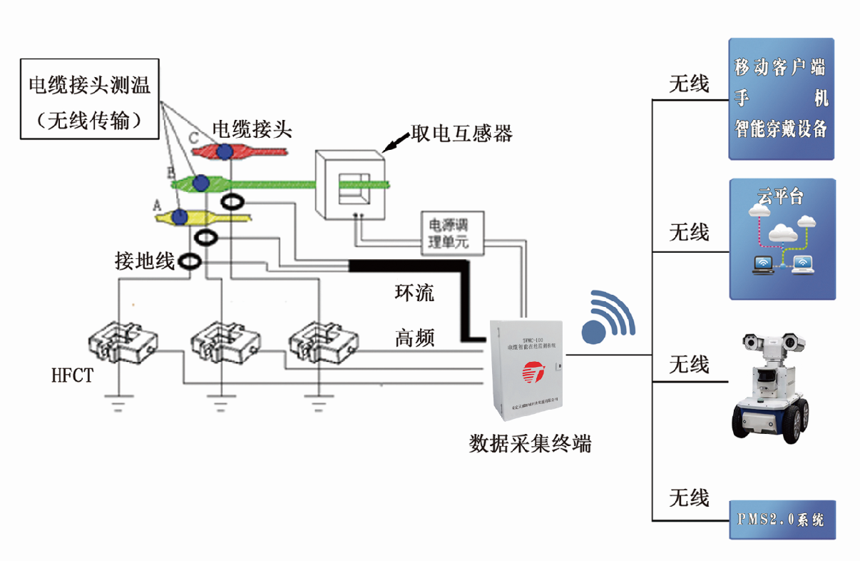 TWMC-100電纜綜合在線監(jiān)測系統(tǒng)由電纜頭測溫裝置、取電裝置、護(hù)套環(huán)流監(jiān)測裝置、局放監(jiān)測裝置及數(shù)據(jù)采集終端組成。獲取局放監(jiān)測數(shù)據(jù)、溫度監(jiān)測數(shù)據(jù)、環(huán)流監(jiān)測數(shù)據(jù),提取監(jiān)測數(shù)據(jù)特性信息,將數(shù)據(jù)通過4G、5G專網(wǎng)或APN專線同時(shí)上傳機(jī)器人、手機(jī)、云平臺及PMS2.0系統(tǒng)。系統(tǒng)能夠與機(jī)器人、手機(jī)、云平臺單獨(dú)組網(wǎng);能夠與PMS2.0系統(tǒng)單獨(dú)組網(wǎng);同時(shí)數(shù)據(jù)采集終端、云平臺、手機(jī)、機(jī)器人也能互聯(lián)互通。通過不同的組網(wǎng)方式,手機(jī)、機(jī)器人、PC機(jī)都能獲取數(shù)據(jù),分析數(shù)據(jù),導(dǎo)出數(shù)據(jù)。