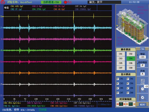 1、8通道獨(dú)立采集數(shù)據(jù)(非通道轉(zhuǎn)換式),同步信號(hào)采樣, 8個(gè)窗口單獨(dú)顯示局放測(cè)量結(jié)果。可對(duì)多種電壓等級(jí)的交直流油浸式變壓器及干式變壓器進(jìn)行局部放電檢測(cè),診斷其內(nèi)部缺陷;
